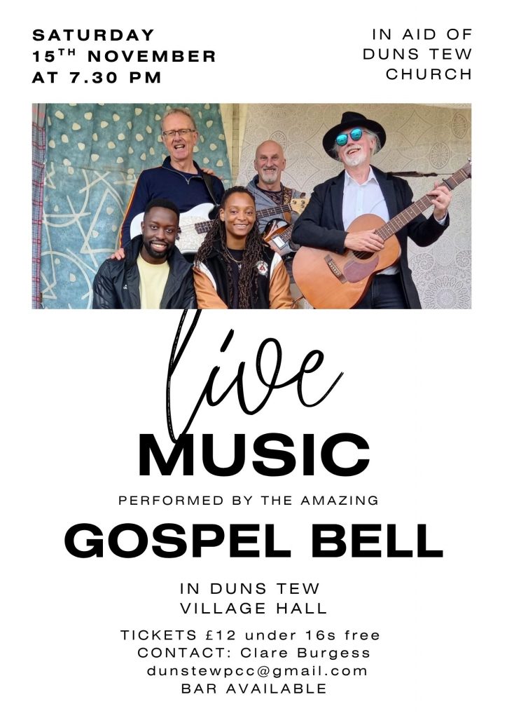 2 November 2025 by Richard Duns Tew Church fundraiser – Saturday 15 November 2025, 7.30pm Do please come and see Gospel Bell at Duns Tew Village Hall on Saturday 15 November, 7.30pm. All proceeds in aid of Duns Tew Church. We’ll look forward to seeing you there!